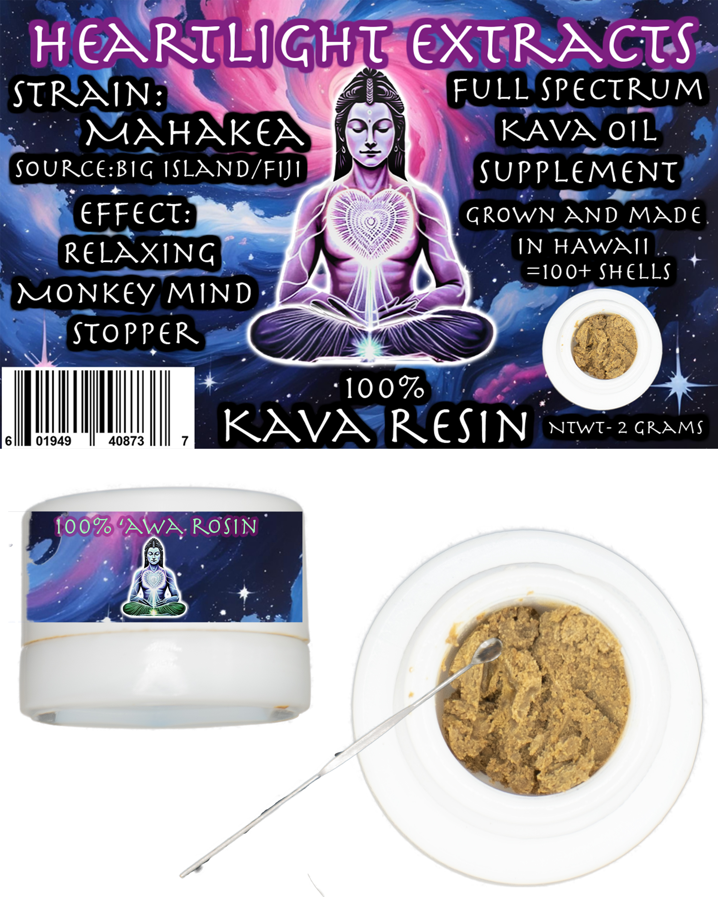 One 2 gram glass container of Mahakea 'Awa root supplement extract. Mahakea is known for its heady and energetic effect, great for a reducing the monkey mind and relaxing into the day with energy. A hawaiian native cultivar as well as a fijian cultivar. Some of our Mahakea is harvested on the Big Island from various local farmers, the rest is sourced from fijian farmers. It is usual for the resin batch to be 70 percent hawaiian and 30 percent fijian to make sure it is always availbale. Always hand chosen by the owner and extractor. The easiest way to share and kava-up on the road with the world's best full spectrum small batch extraction. Equivalent to 100 x 8 oz cups of kava or 100+ shells.