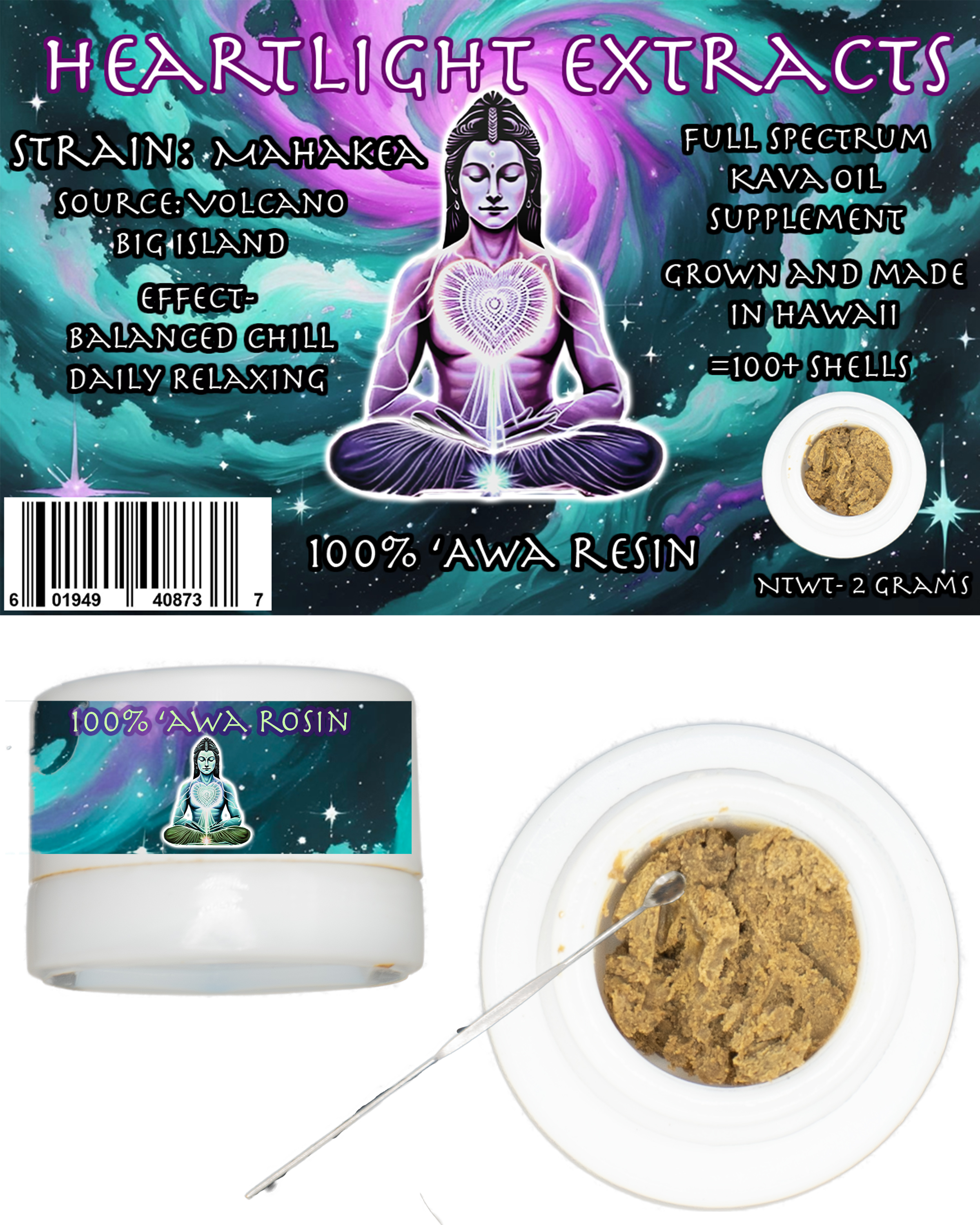 One 2 gram glass container of Mahakea 'Awa root supplement extract. Mahakea is known for its balanced, slightly heavy effect, great for a body and mind experience. A hawaiian native cultivar for the kavasaur. All our Mahakea is harvested on The Big Island from vMountain View/Volcano. Always hand chosen by the owner and extractor. The easiest way to share and kava-up on the road with the world's best full spectrum small batch extraction. Equivalent to 100 x 8 oz cups of kava or 100+ shells. This is a limited edition strain, available upon whats ready to be harvested.