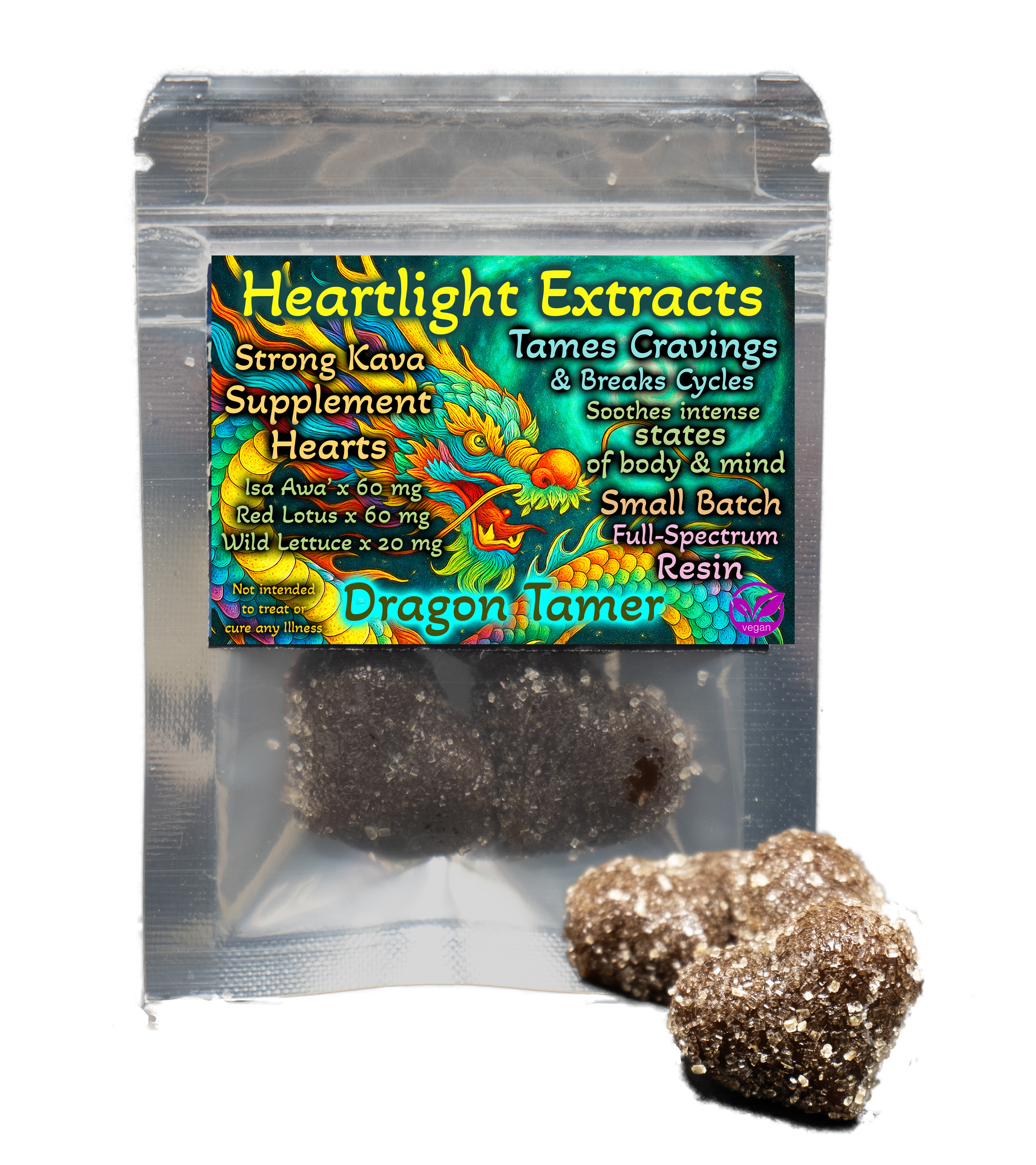 Supplement packs of 60 mg Relaxing Isa 'Awa, 60mg Red Lotus, and 20mg wild lettuce in an organic & vegan whole food gummy. Our Vegan Dragon Tamer Supplement Space Treats use Isa 'Awa for a body relaxing heavy mental feeling, red lotus for relaxing the hardships of the body, and wild lettuce to further the heavy experience and relieve muscle tension.