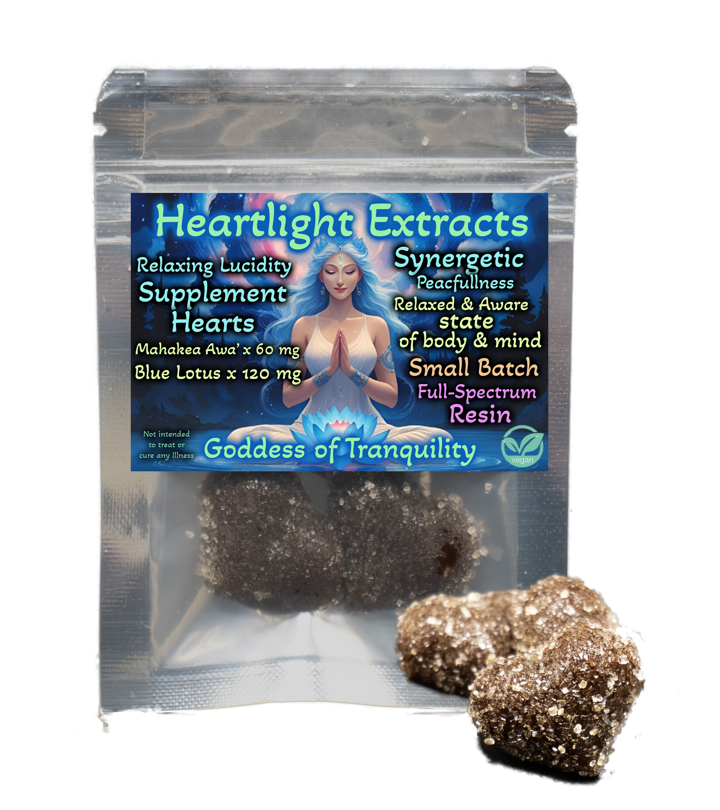 Supplement packs of 60 mg Relaxing Isa 'Awa, 60 mg Blue Lotus, and 60 mg of Kanna in a vegan organic gummy. Our Vegan Tranquility Supplement Treats use Mahakea 'Awa for an energetic day time feeling, blue lotus for relaxing the worried brain, and bobinsana to open the heart and provide more energy.
